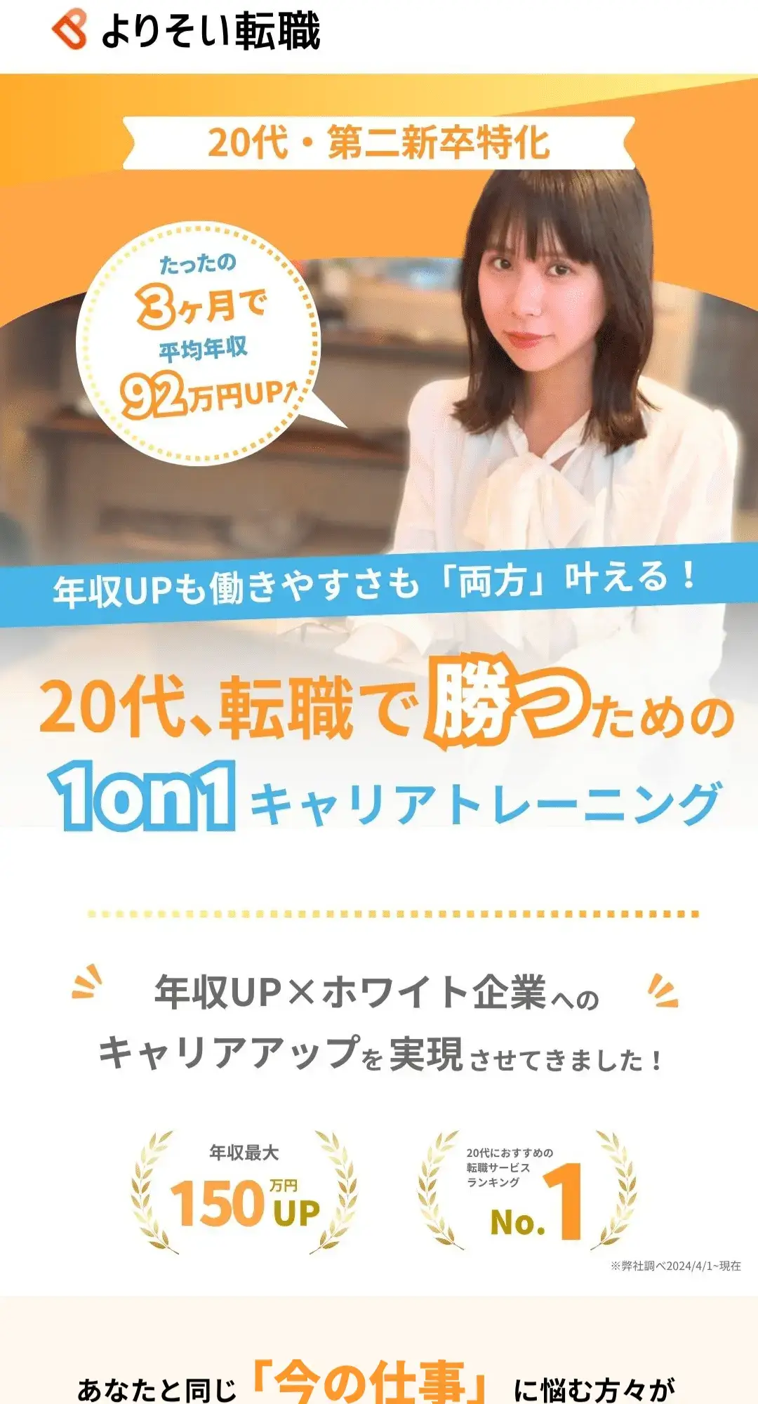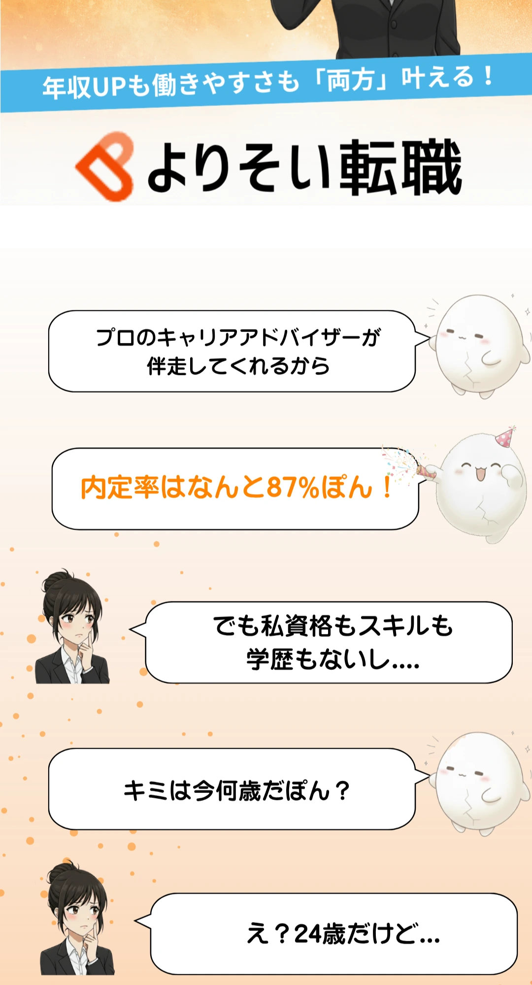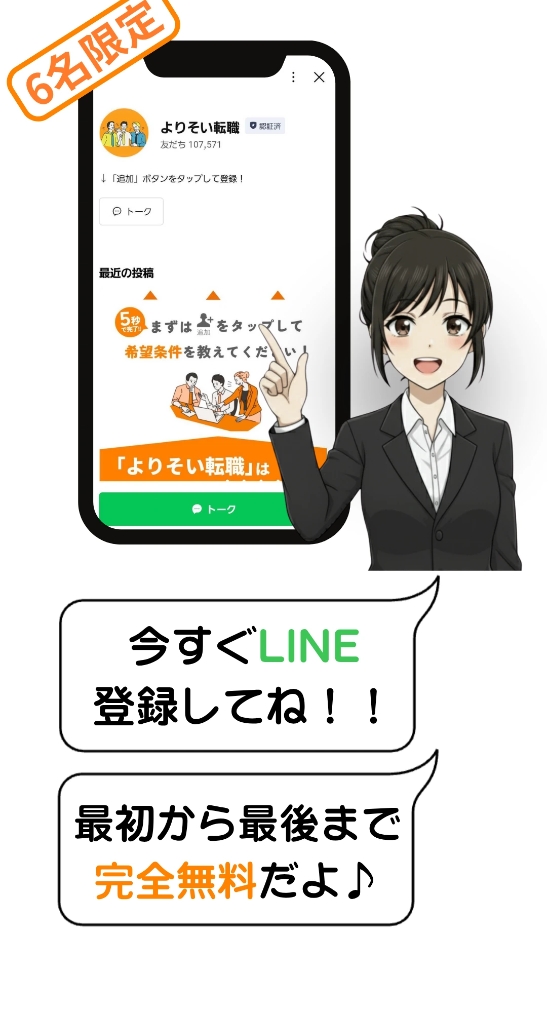 しかし、よりそい転職で取り扱っている求人の多くは、20代をメインとした若手人材の採用を希望している会社が多いため、ご経歴やご希望によってはお仕事をご紹介できない場合もございます。
