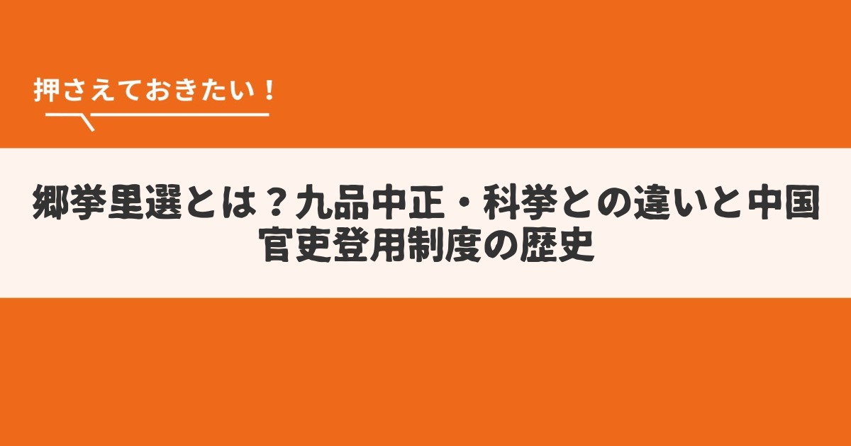 中国史において重要な官吏登用制度には、「郷挙里選」「九品中正」「科挙」という三つの大きな流れがあります。これらは時代ごとに特徴や目的、選ばれ方が大きく異なり... -